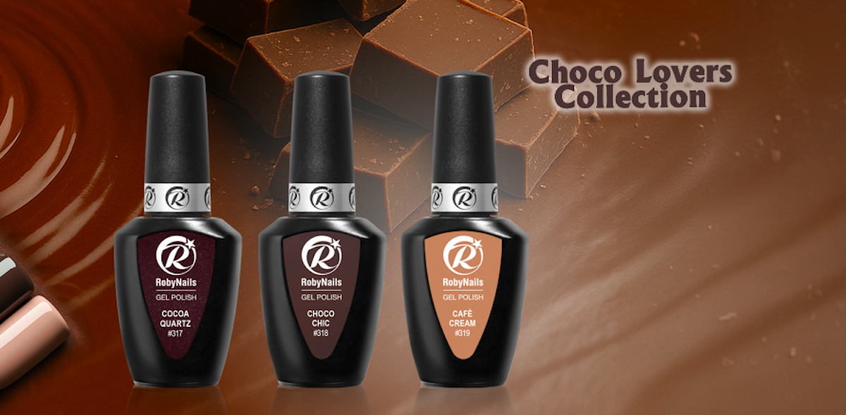 Die "Choco Lovers Collection" von RobyNails, eine Kollektion von cremigen, raffinierten und unwiderstehlichen Gel-Nagellacken, inspiriert von den köstlichen Schokoladentönen der Saison, bietet eine Auswahl an drei Farbtönen, die nach dem Genuss von Schokolade duften sollen, mit intensivem Farbschutz bereits in der ersten Schicht.